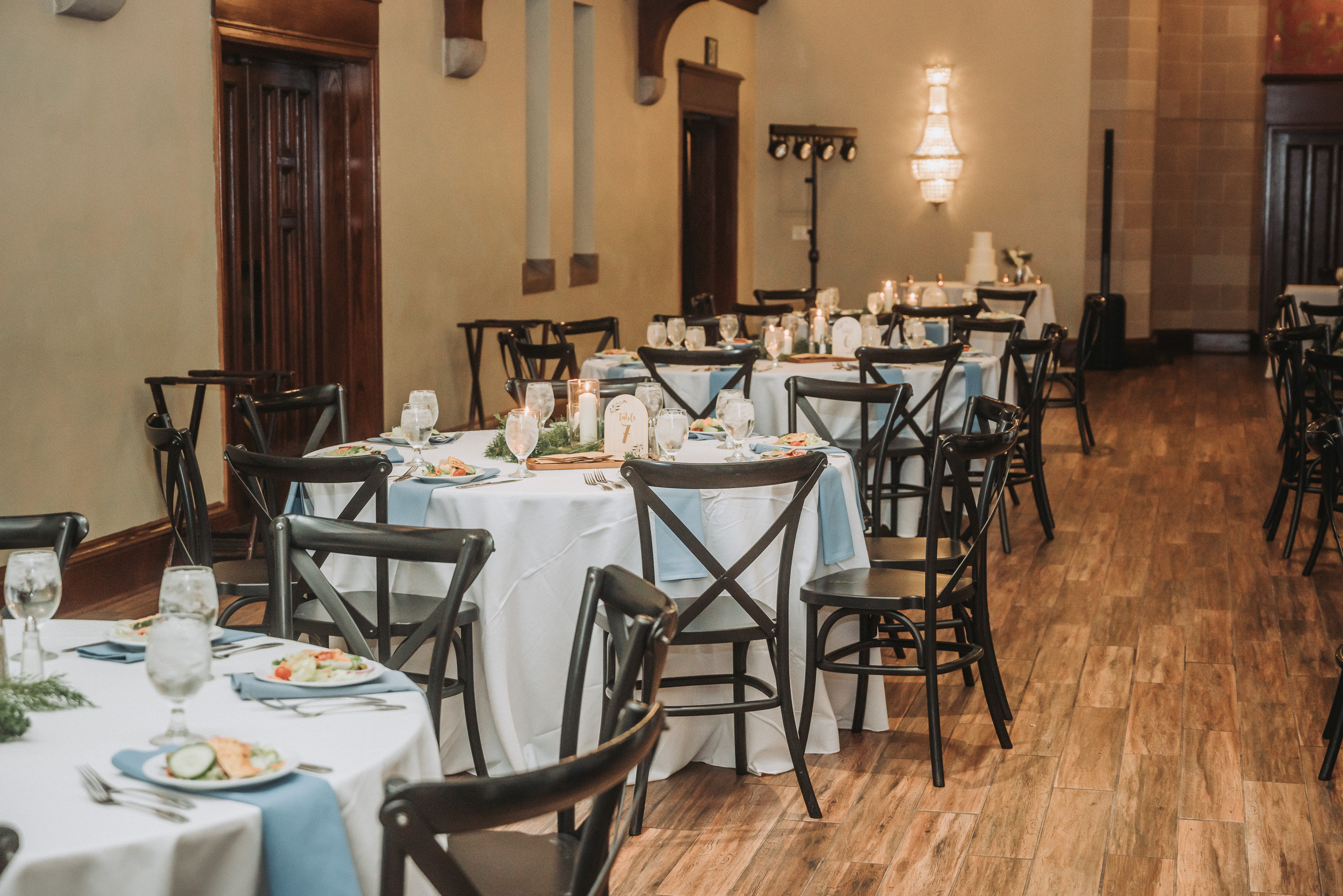 Katie and Carson leaned into a color palette of crisp white and deep hunter green, accented by textured greenery and organic elements. Their florist, Walter Knoll, created arrangements filled with evergreen branches, soft white blooms, and natural movement that complemented the venue perfectly. Small details like juniper berries and layered greenery tied everything together and made the design feel intentional from start to finish.